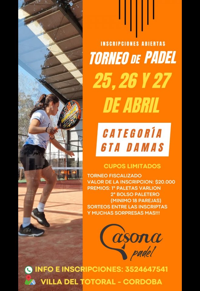 »» Evento: 6TA DAMAS - ABRIL »» Localidad: Villa del Totoral »» Fechas: 25/04/2025 al 27/04/2025
